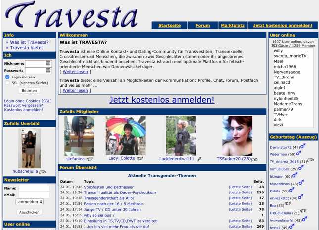 Bei Travesta.de handelt es sich um eine Kontakt- und Dating-Community für Transsexuelle, Transvestiten, Crossdresser und Intersexuelle. Wer in seinem normalen Leben keine Möglichkeit hat, Gleichgesinnte kennenzulernen, für den ist diese Plattform perfekt geeignet. Hier kann jeder anonym und diskret seiner besonderen Lebensart nachgehen.